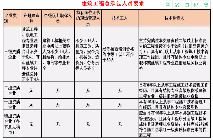 根據(jù)《住房城鄉(xiāng)建設(shè)部關(guān)于簡(jiǎn)化建筑業(yè)企業(yè)資質(zhì)標(biāo)準(zhǔn)部分指標(biāo)的通知》(建市[2016]226號(hào))文件,除各類別最低等級(jí)資質(zhì)外,取消關(guān)于注冊(cè)建造師、中級(jí)以上職稱人員、持有崗位證書的現(xiàn)場(chǎng)管理人員…