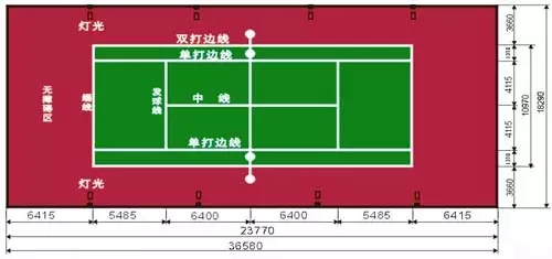 出自:搜建筑 標(biāo)準(zhǔn)網(wǎng)球場(chǎng)平面圖[尺寸圖] 國(guó)際網(wǎng)聯(lián)和國(guó)家體委頒布的《網(wǎng)球競(jìng)賽規(guī)則》中規(guī)定,一片標(biāo)準(zhǔn)網(wǎng)球場(chǎng)地的占地面積不小于36.6米(南北長(zhǎng))×18.3(東西寬)米,這一尺寸也是一…