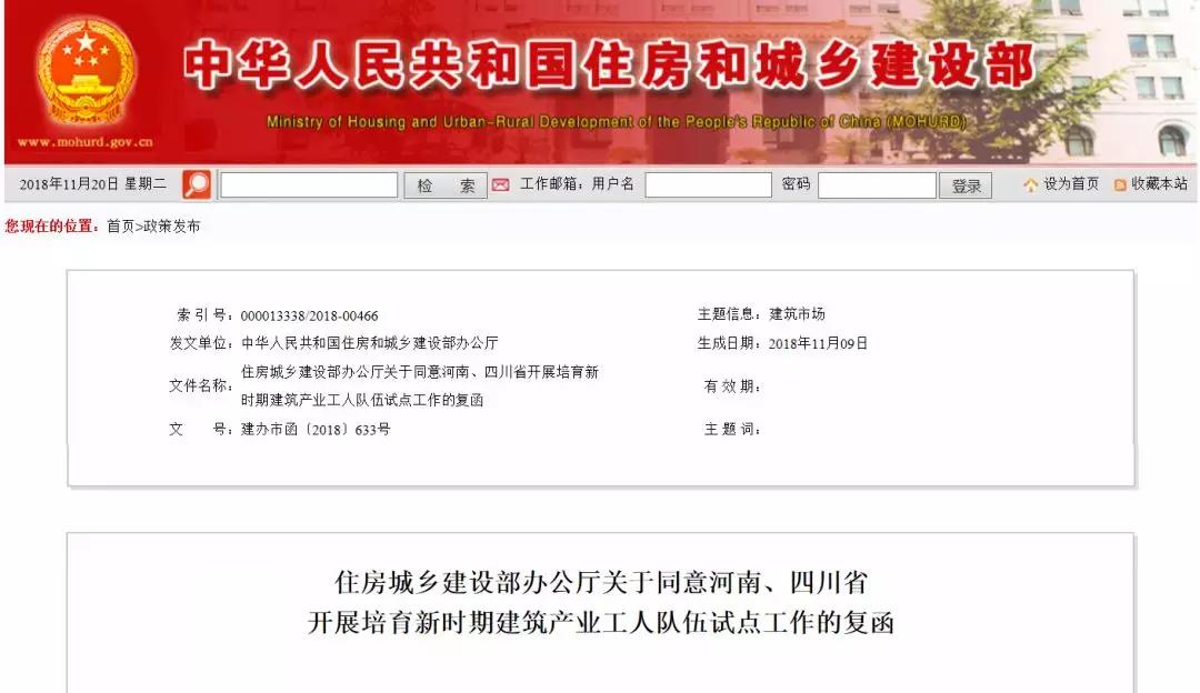 近日,住房城鄉(xiāng)建設(shè)部發(fā)出復(fù)函 ,同意河南省、四川省開(kāi)展培育新時(shí)期建筑產(chǎn)業(yè)工人隊(duì)伍試點(diǎn)工作。河南、四川省住房城鄉(xiāng)建設(shè)廳:《河南省住房城鄉(xiāng)建設(shè)廳關(guān)于培育新時(shí)期建筑產(chǎn)業(yè)工人隊(duì)伍試點(diǎn)…