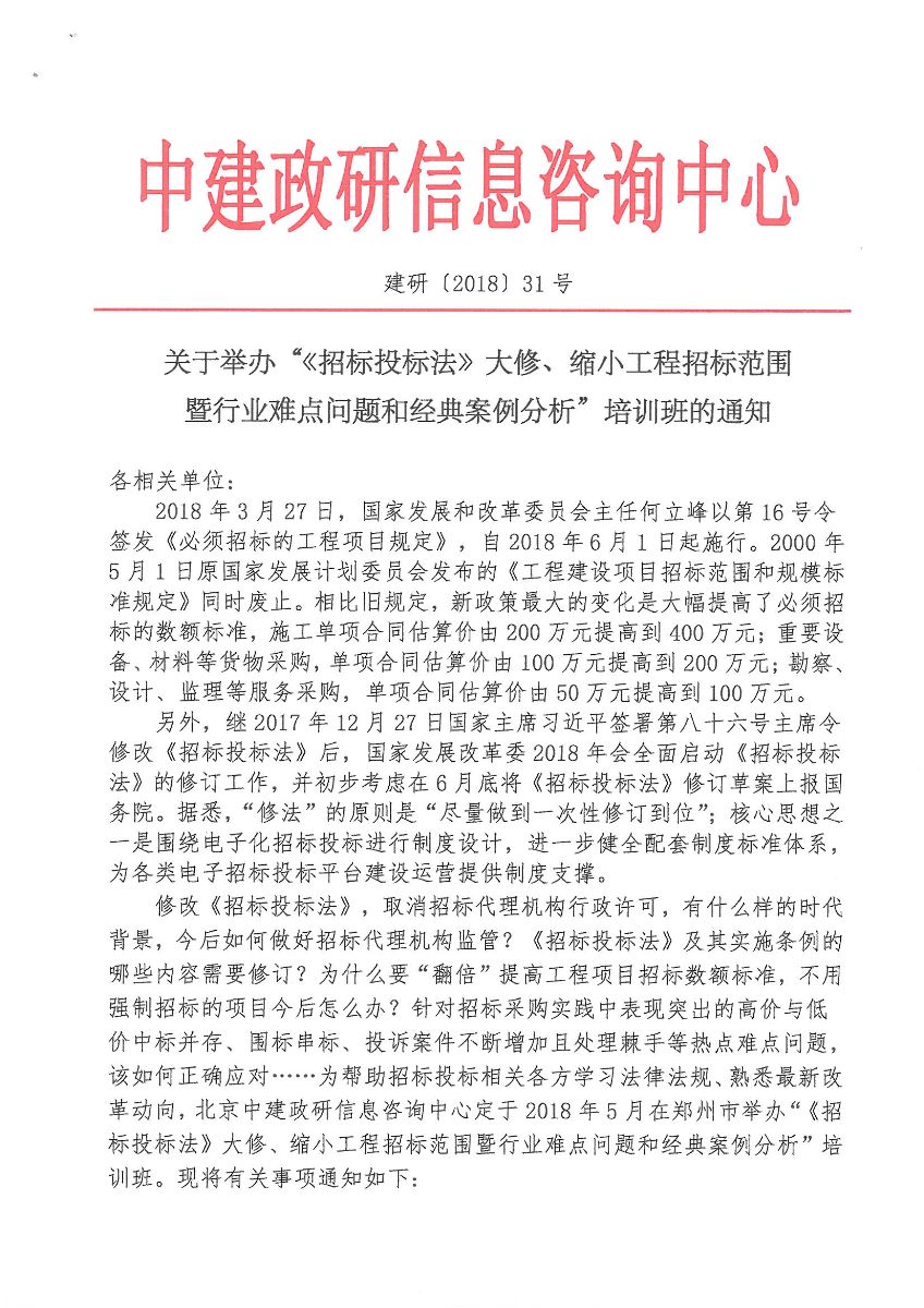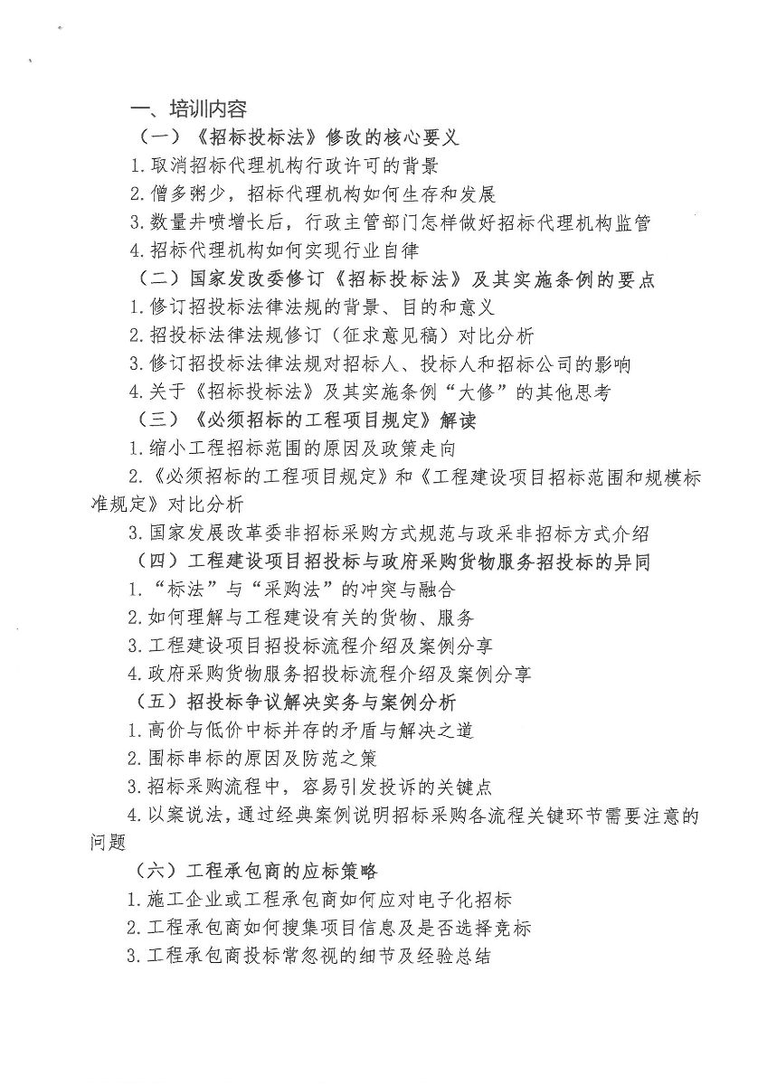 附件2:關(guān)于舉辦“<招標(biāo)投標(biāo)法>大修、縮小工程招標(biāo)范圍暨行業(yè)難點(diǎn)問(wèn)題和經(jīng)典案例分析”培訓(xùn)班的通知
