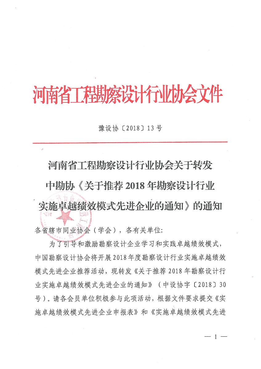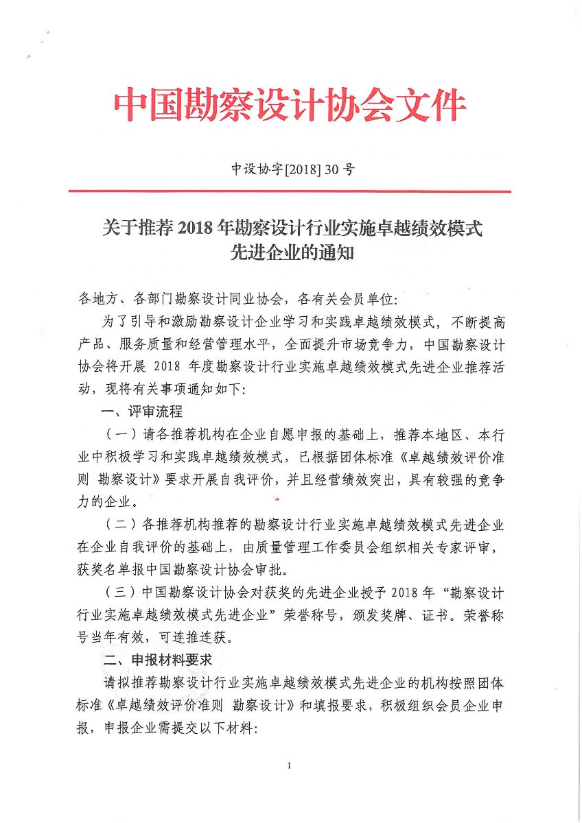 協(xié)會關(guān)于轉(zhuǎn)發(fā)中勘協(xié)《關(guān)于推薦2018年勘察設(shè)計行業(yè)實(shí)施卓越績效模式先進(jìn)企業(yè)的通知》的通知