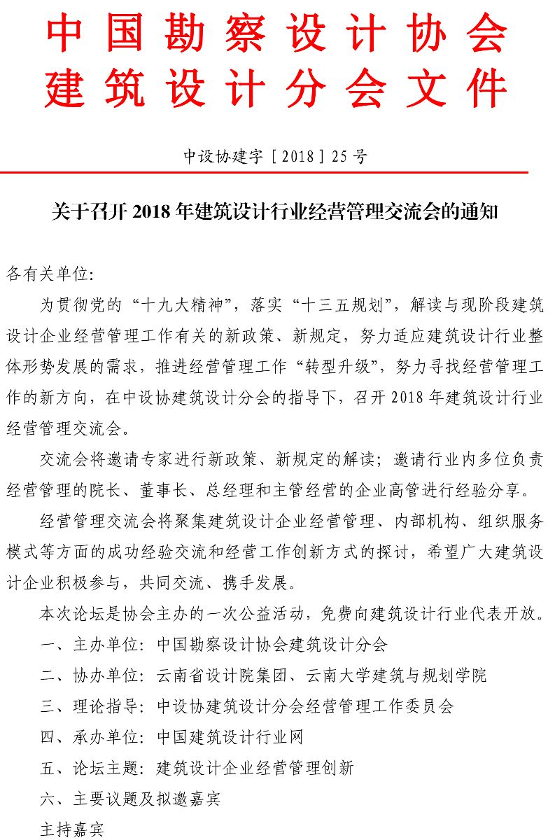中勘協(xié)關(guān)于召開2018年建筑設(shè)計行業(yè)經(jīng)營管理交流會的通知
