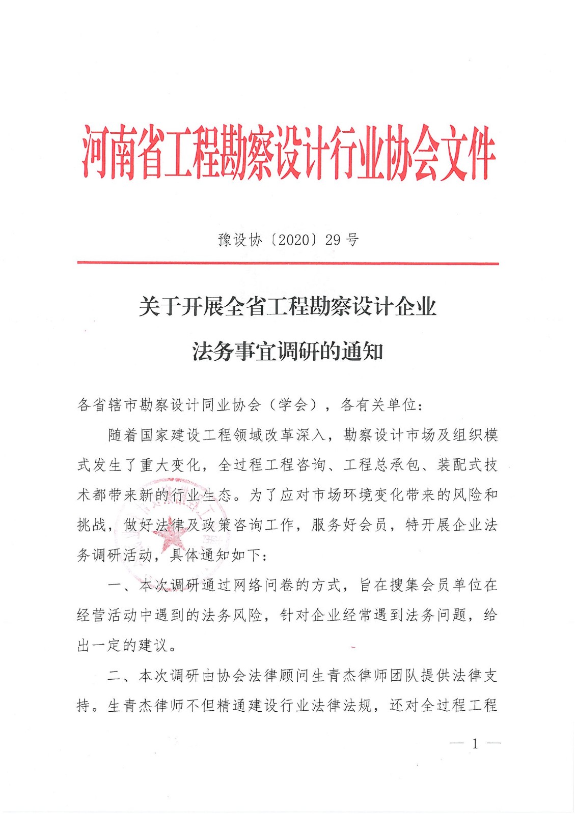 協(xié)會(huì)關(guān)于開(kāi)展全省工程勘察設(shè)計(jì)企業(yè)法務(wù)事宜調(diào)研的通知