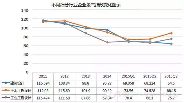 10月27日,上海天強管理咨詢有限公司發(fā)布了行業(yè)首個工程勘察設(shè)計企業(yè)發(fā)展景氣指數(shù)及企業(yè)家信心指數(shù)。根據(jù)此次發(fā)布的數(shù)據(jù),以100為基準(zhǔn),2015年第三季度,行業(yè)內(nèi)企業(yè)發(fā)展景氣指數(shù)跌至66,表明行業(yè)發(fā)展陷入低迷狀態(tài);而企業(yè)家發(fā)展信心指數(shù)已經(jīng)跌至41.8,企業(yè)家對行業(yè)發(fā)展預(yù)期已陷入悲觀狀態(tài)。