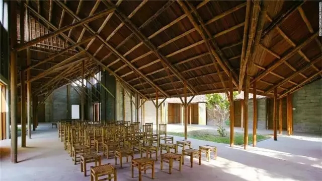 整個(gè)設(shè)計(jì)簡(jiǎn)單質(zhì)樸,并且充分利用了當(dāng)?shù)氐馁Y源和材料。由竹子與椰子樹葉鋪成的房頂一起極大地削弱了太陽(yáng)光輻射的威力,同時(shí)還為室內(nèi)提供了陰涼。