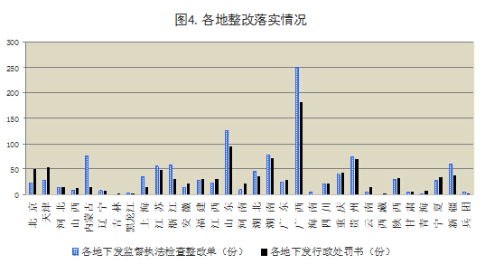 各地共下發(fā)監(jiān)督執(zhí)法檢查整改單30150份、行政處罰書1036份,處罰相關(guān)單位794個,處罰相關(guān)人員375名,實(shí)施信用懲戒900起,曝光違法違規(guī)典型案例376起。從行政處罰數(shù)量看,廣西、山東、湖南3個省(區(qū))處罰力度較大;從曝光典型案例數(shù)量看,江西、新疆、福建、重慶4個省(區(qū)、市)曝光力度較大。
