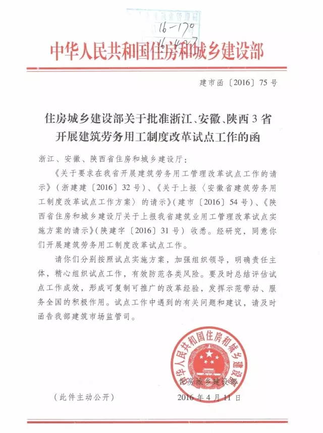 2016年4月11日,住房和城鄉(xiāng)建設部批準浙江、安徽、陜西3省開展建筑勞務用工制度試點工作方案,隨后安徽省、浙江省、陜西省陸續(xù)發(fā)布“建筑勞務用工制度改革試點方案”。