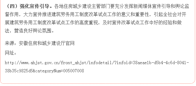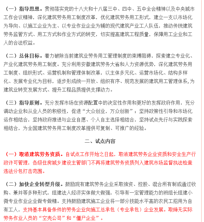 安徽省試點方案覆蓋全省,力度非常大,并直接提出了“自試點工作開始之日起(即2016年6月1日),取消建筑勞務企業(yè)資質和安全生產行政許可管理,各級住房城鄉(xiāng)建設主管部門不再將建筑勞務資質列入建筑市場監(jiān)督執(zhí)法檢查違法分包打擊范圍。”。