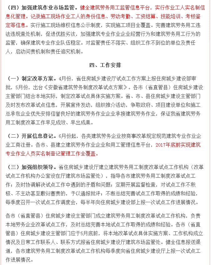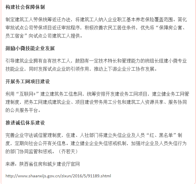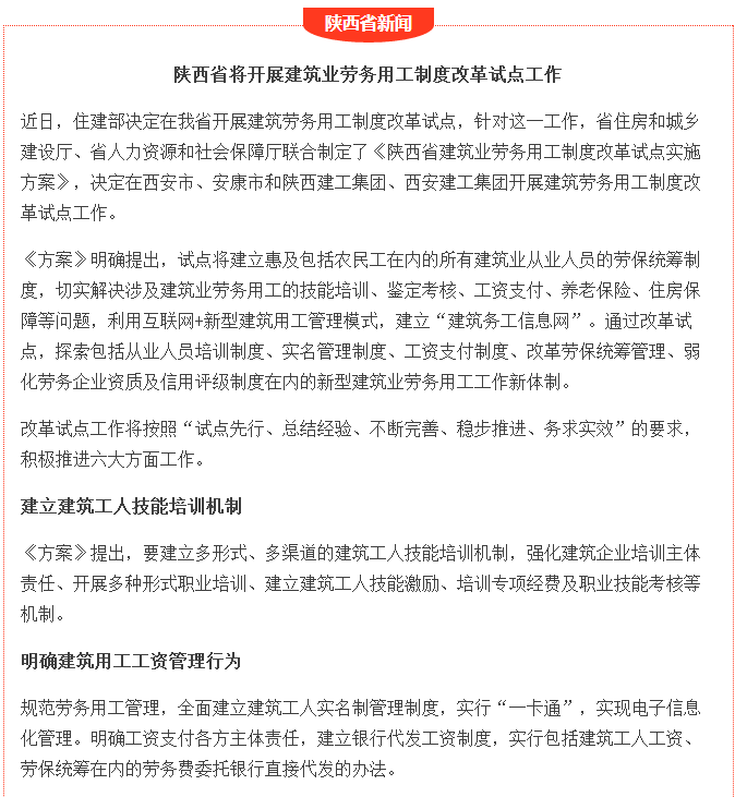 陜西省決定在西安市、安康市和陜西建工集團、西安建工集團開展建筑勞務用工制度改革試點工作,強調了:利用互聯(lián)網+新型建筑用工管理模式,建立“建筑務工信息網”。通過改革試點,探索包括從業(yè)人員培訓制度、實名管理制度、工資支付制度、改革勞保統(tǒng)籌管理、弱化勞務企業(yè)資質及信用評級制度在內的新型建筑業(yè)勞務用工工作新體制。