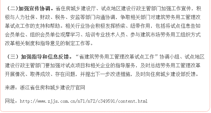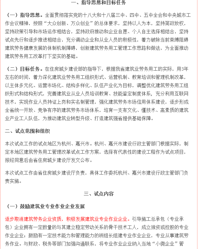 浙江省試點范圍選擇了杭州市、嘉興市,提出:逐步取消建筑勞務企業(yè)資質,積極發(fā)展建筑業(yè)專業(yè)作業(yè)企業(yè)。