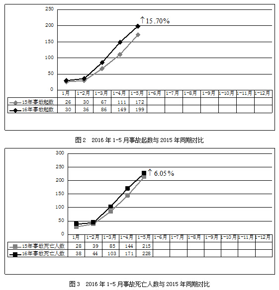 2016年1-5月,全國共發(fā)生房屋市政工程生產(chǎn)安全事故199起、死亡228人,比去年同期事故起數(shù)增加27起,死亡人數(shù)增加13人,同比分別上升15.70%和6.05%(見圖2、圖3)。