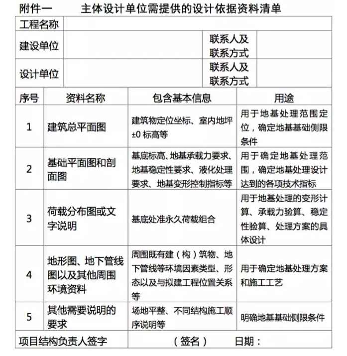 六、建設(shè)工程項目主體設(shè)計單位應(yīng)提供上部結(jié)構(gòu)類型,基礎(chǔ)形式,基礎(chǔ)埋深、基礎(chǔ)平面布置及荷載分布等設(shè)計條件,并提出地基處理范圍及地基承載力、變形和穩(wěn)定性等設(shè)計要求(主體設(shè)計單位需提供的設(shè)計依據(jù)資料清單,附件),并由結(jié)構(gòu)專業(yè)負(fù)責(zé)人對地基處理工程設(shè)計要求進行簽字確認(rèn)。