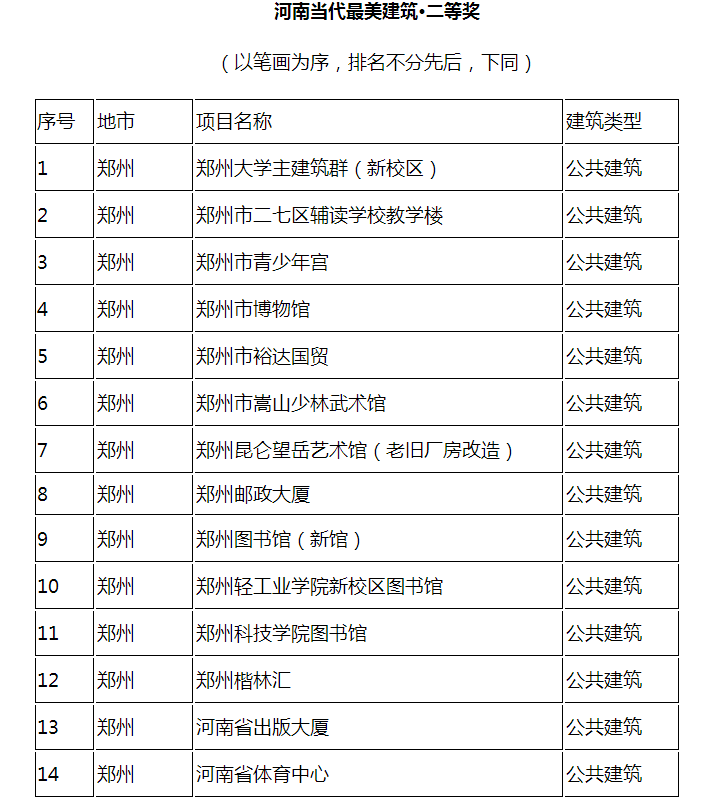 據(jù)介紹,本次活動(dòng)共評(píng)選出125個(gè)獲獎(jiǎng)項(xiàng)目,鄭州二七紀(jì)念塔等10個(gè)項(xiàng)目獲得“河南當(dāng)代最美建筑·一等獎(jiǎng)(標(biāo)志性建筑)”,鄭州大學(xué)新校區(qū)建筑群等50個(gè)項(xiàng)目獲“河南當(dāng)代最美建筑·二等獎(jiǎng)”;華北水利水電大學(xué)新校區(qū)建筑群等40個(gè)項(xiàng)目獲“河南當(dāng)代最美建筑·提名獎(jiǎng)”;洛陽(yáng)泉舜財(cái)富中心購(gòu)物中心等25個(gè)項(xiàng)目獲“河南當(dāng)代最美建筑·網(wǎng)絡(luò)人氣獎(jiǎng)”。