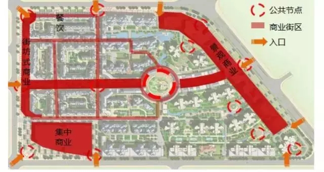 商業(yè)氛圍由廣場式道路深入社區(qū)內(nèi)部并相互銜接,項目北側(cè)延城市道路布置了大量餐飲店,在西南角為一個集中式商業(yè),西側(cè)設(shè)置了獨立的街坊式商業(yè)街區(qū),東部為景觀商業(yè)街區(qū),其余街道布置了大量商鋪。