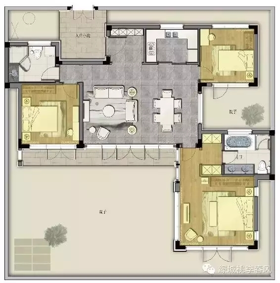 •圍合式庭院布局,推窗見景,敞闊院落可自由發(fā)揮業(yè)主喜好;