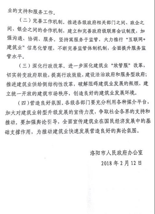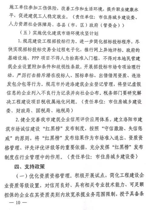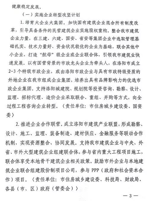 來源:洛陽市政府網 洛陽日報 解讀: 日前,洛陽市印發(fā)《關于促進建筑業(yè)持續(xù)健康發(fā)展的實施意見》(以下簡稱《意見》),明確提出將加快建筑業(yè)供給側結構性改革,推動洛陽市建成與中原城市群副中心城市地位相匹配的建筑業(yè)強市。 建筑業(yè)是洛陽市傳統優(yōu)勢產業(yè),關聯50余個上下游產業(yè)。按照《意見》,洛陽市將綜合運用政策引導、項目帶動、產業(yè)支撐、市場培育、資金激勵等手段,進一步優(yōu)化產業(yè)結構、推進轉型升級、提升發(fā)展質量、提高經濟效益,促進洛陽市建筑業(yè)持續(xù)健康發(fā)展。 《意見》明確洛陽市建筑業(yè)發(fā)展目標:力爭到2020年,全市建筑業(yè)總產值由2017年的1119億元增加到1500億元,建筑業(yè)產值增速保持10%以上,建筑業(yè)在國民經濟中的支撐作用更加明顯。建筑企業(yè)實力明顯增強,建筑業(yè)特級資質企業(yè)由目前的6家增加到9家;年產值超50億元的建筑企業(yè)由目前的2家增加到5家;年產值超10億元的建筑企業(yè)由目前的10家增加到15家。 打造建筑業(yè)“航母” 建筑業(yè)發(fā)展,加快企業(yè)轉型是基礎。按照計劃,洛陽市將著力培育大型建筑企業(yè)集團,整合洛陽市建筑企業(yè)力量,在河南三建、河南六建、國安集團、省安集團等企業(yè)中選取管理基礎扎實、技術力量強、資金狀況較優(yōu)的企業(yè)為基礎,聯合中小企業(yè),打造“航母”級企業(yè)或企業(yè)聯合體。 同時,洛陽市住建部門將積極引導以市政龍頭企業(yè)為牽頭人,在洛陽市成立2個至3個特級市政企業(yè),或由洛陽市政企業(yè)與具有市政特級資質的外地企業(yè)聯合在洛組成企業(yè)集團,培養(yǎng)出具有品牌影響力的優(yōu)選市政企業(yè)集團。此外,洛陽市還將支持洛陽城建院、規(guī)劃院等投資咨詢、勘察、設計、監(jiān)理、招標代理、造價企業(yè)采取聯合、重組、并購等方式,向全過程工程咨詢企業(yè)轉型。 《意見》還對建筑企業(yè)做大做強做優(yōu)提出鼓勵政策:鼓勵建筑企業(yè)拓寬經營范圍,鼓勵企業(yè)拓展國內外市場,鼓勵和培育優(yōu)秀企業(yè)上市。 規(guī)范招投標交易 洛陽市住建委相關負責人表示,洛陽市將持續(xù)優(yōu)化建筑市場環(huán)境,為建筑業(yè)發(fā)展提供更多服務保障。 ●推進企業(yè)合作聯營 成立洛陽市建筑產業(yè)聯盟,形成勘察、設計、施工、監(jiān)理、裝備制造、建材供應、金融服務等聯動合作機制,實現資源整合、協同發(fā)展。支持洛陽市建筑企業(yè)與中央、外省、省內市外大型建筑企業(yè)組建聯合體,參與省內重大工程項目施工,聯合體享受本地骨干建筑企業(yè)相關政策。 ●規(guī)范建設工程招投標行為 洛陽市住建委將簡化招標投標程序,盡快實現招投標交易全過程電子化,推行網上異地評標。政府的基礎設施、PPP項目不得人為抬高準入門檻,不得對本地民營建筑企業(yè)設置附加條件和歧視性條款。開展招投標市場專項治理行動,嚴厲打擊排斥潛在投標人、圍標串標、出借借用資質、違法發(fā)包分包等行為。規(guī)范市外進洛建筑企業(yè)登記管理,將登記虛假信息的企業(yè)列入不良行為記錄并向社會公布。 ●健全建筑企業(yè)信用評價體系 按照“守信激勵、失信懲戒”的原則,建立洛陽市建筑市場誠信建設“紅黑榜”發(fā)布制度,將“紅黑榜”發(fā)布結果作為市場準入退出、資質資格管理、評先評優(yōu)評級等的重要依據,充分發(fā)揮企業(yè)信用在行業(yè)管理中的作用。 實行“獎上獎” 《意見》還提出,洛陽市將出臺更多優(yōu)惠政策,促進建筑業(yè)更好更快發(fā)展。 ●優(yōu)化資質管理 對信用良好、具有相關專業(yè)技術能力、可足額擔保的企業(yè)在其資質類別內放寬承攬業(yè)務范圍限制,試點授予具備條件的大型骨干建筑企業(yè)初、中級專業(yè)技術資格評審權和技能培訓鑒定資格。 ●企業(yè)創(chuàng)新有獎 對取得特級總承包施工資質或獲得國家級工程質量獎的施工企業(yè),注冊地政府應給予50萬元獎勵。對獲得“魯班獎”“中州杯”獎的項目,建筑單位對施工企業(yè)分別按含稅工程造價的3%不超過1000萬元、1.5%不超過300萬元給予獎勵,對監(jiān)理企業(yè)分別按照監(jiān)理服務費的5%、3%給予獎勵。 ●總部遷入有獎 對將總部遷入洛陽市的施工總承包企業(yè),按洛陽市招商引資獎勵辦法予以獎勵,并優(yōu)先滿足企業(yè)用地、融資、人才保障等方面需求。對總部設在洛陽市、年產值超百億元的特級建筑業(yè)和綜合甲級設計企業(yè),將企業(yè)總部辦公、科研培訓的建設用地規(guī)劃為工業(yè)用地,按照工業(yè)用地性質予以安排。 ●講信用享優(yōu)惠 對評為“AAA”信用等級建筑企業(yè),支持采用以銀行保函形式繳納投標保證金、履約保證金、質量保證金;新開工項目工傷保險費率由1‰調至0.8‰,連續(xù)兩年以上未發(fā)生工傷事故的下調至0.4‰。