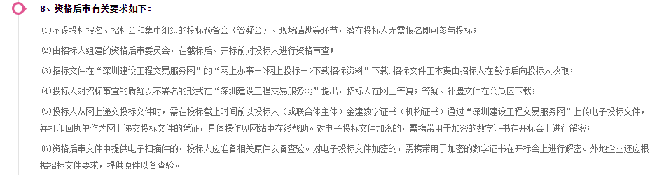 | 其他資質(zhì): | 1、工程設(shè)計(jì)建筑行業(yè)(建筑工程)專業(yè)甲級(jí)或以上資質(zhì); 2、設(shè)計(jì)單位或聯(lián)合體單位之一近3年(2015年1月1日至今)參與建筑面積不少于50萬平方米的房屋建筑工程的類似項(xiàng)目業(yè)績,在建或已建成的項(xiàng)目,提供中標(biāo)通知書、設(shè)計(jì)合同關(guān)鍵頁及簽字蓋章頁; 3、執(zhí)行建筑師管理團(tuán)隊(duì):為獨(dú)立法人資格; 4、項(xiàng)目負(fù)責(zé)人資格:具有注冊(cè)一級(jí)建筑師執(zhí)業(yè)資格。 5、本項(xiàng)目接受聯(lián)合體投標(biāo),聯(lián)合體單位不得超過3家,除執(zhí)行建筑師管理團(tuán)隊(duì)外,聯(lián)合體單位均需具備工程設(shè)計(jì)建筑行業(yè)(建筑工程)專業(yè)甲級(jí)或以上資質(zhì),聯(lián)合體牽頭設(shè)計(jì)單位必須具有工程設(shè)計(jì)建筑行業(yè)(建筑工程)專業(yè)甲級(jí)或以上資質(zhì),且注冊(cè)地必須位于深圳市,或在深圳市設(shè)有分支機(jī)構(gòu)。 備注:本次采用電子招投標(biāo)形式,請(qǐng)各投標(biāo)人根據(jù)招標(biāo)文件要求編制投標(biāo)文件及辦理相關(guān)數(shù)字證書,投標(biāo)文件的遞交應(yīng)由聯(lián)合體牽頭單位在深圳市建設(shè)工程交易服務(wù)網(wǎng)遞交,且必須在深圳市住房和建設(shè)局完成企業(yè)信息備案及辦理數(shù)字證書,境內(nèi)外企業(yè)均必須在深圳市建設(shè)工程交易服務(wù)網(wǎng)進(jìn)行備案(企業(yè)信息登記)(www.szjsjy.com.cn)。請(qǐng)各投標(biāo)人提前辦理好企業(yè)信息備案及相關(guān)數(shù)字證書。 | ||