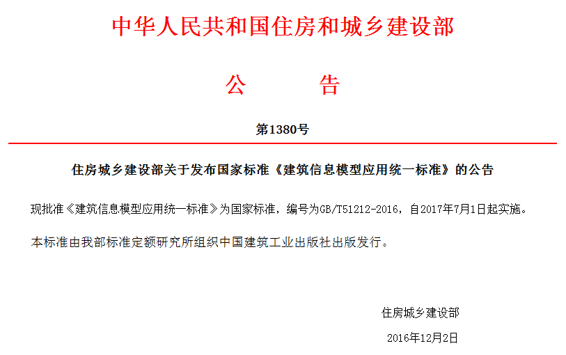 住房城鄉(xiāng)建設(shè)部關(guān)于發(fā)布國家標(biāo)準(zhǔn)《建筑信息模型應(yīng)用統(tǒng)一標(biāo)準(zhǔn)》的公告