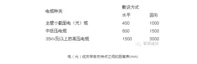 五、電(光)纜支架各支持點(diǎn)之間的距離,不宜大于下表的規(guī)定。