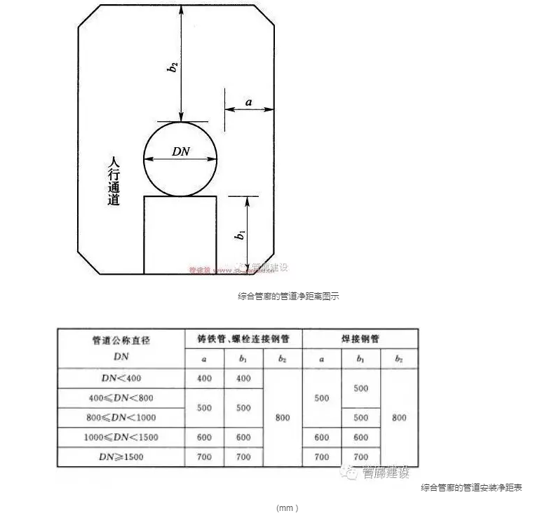 七、綜合管廊的管道安裝凈距(如下圖示),不宜小于下表規(guī)定的數(shù)值。