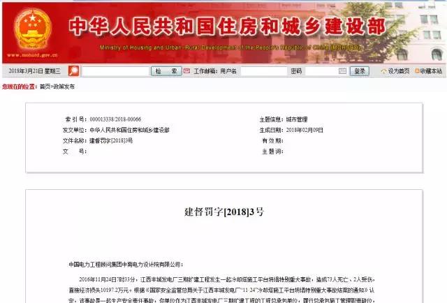 3月20日, 住建部網(wǎng)站公布了對江西豐城發(fā)電廠三期擴建工程總承包單位中國電力工程顧問集團中南電力設計院有限公司的處罰決定。