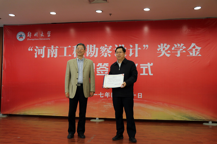 4月20日,“河南工程勘察設計”獎學金簽約儀式在鄭大校園舉行。河南省水利勘測設計研究有限公司是捐資企業(yè)之一,該公司董事長翟淵軍上臺領取捐贈證書。