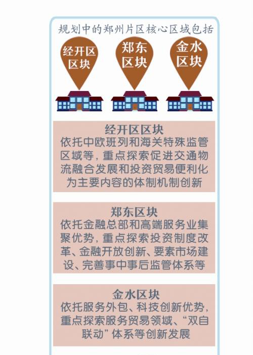 按照規(guī)劃,河南自貿(mào)區(qū)鄭州片區(qū)核心區(qū)域包括經(jīng)開區(qū)區(qū)塊、鄭東區(qū)塊和金水區(qū)塊。