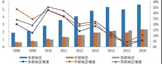 從區(qū)域上看,東部地區(qū)依然是房地產(chǎn)投資的主要區(qū)域。2016年我國(guó)東部地區(qū)完成房地產(chǎn)投資5.6萬(wàn)億元,高于中西部房地產(chǎn)完成投資的總和;東部地區(qū)仍是房地產(chǎn)投資的主要區(qū)域,給建筑設(shè)計(jì)企業(yè)帶來(lái)的業(yè)務(wù)機(jī)會(huì)也更多。然而,2014年前中西部房地產(chǎn)完成投資增速普遍高于東部地區(qū),2015年中西部房地產(chǎn)完成投資增速減緩,但2016年中西部房地產(chǎn)完成投資增速依然高于東部地區(qū),未來(lái)中西部發(fā)展速度會(huì)繼續(xù)高于東部地區(qū)。