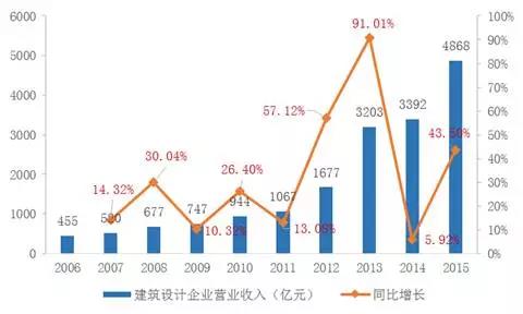近年來(lái),受益于城鎮(zhèn)化進(jìn)程的推進(jìn),我國(guó)建筑設(shè)計(jì)行業(yè)發(fā)展迅速,隊(duì)伍數(shù)量、經(jīng)營(yíng)規(guī)模、管理水平和經(jīng)濟(jì)效益均得到了較快發(fā)展。2010-2014年,整體呈現(xiàn)增長(zhǎng)態(tài)勢(shì),但增幅不穩(wěn),受宏觀經(jīng)濟(jì)增速放緩、房地產(chǎn)行業(yè)景氣度下滑等因素的影響,2014年建筑設(shè)計(jì)企業(yè)的營(yíng)業(yè)收入增長(zhǎng)速度大幅度下降,2015年增幅有所回升,但仍未恢復(fù)之前較高水平。