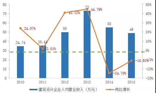 把行業(yè)從業(yè)人員數(shù)量考慮進(jìn)去,情況更加令人擔(dān)憂。建筑設(shè)計(jì)企業(yè)人均營(yíng)業(yè)收入在2010-2013年一直處于增長(zhǎng)態(tài)勢(shì),2014年這種樂(lè)觀的情況被打破,開(kāi)始呈現(xiàn)下降趨勢(shì),2014和2015年增長(zhǎng)率均為負(fù)值,說(shuō)明建筑設(shè)計(jì)行業(yè)人員數(shù)量過(guò)快增長(zhǎng),出現(xiàn)產(chǎn)能嚴(yán)重過(guò)剩現(xiàn)象。2015年建筑設(shè)計(jì)企業(yè)人均營(yíng)業(yè)收入49萬(wàn)元,低于全國(guó)勘察設(shè)計(jì)行業(yè)平均水平(89萬(wàn))。