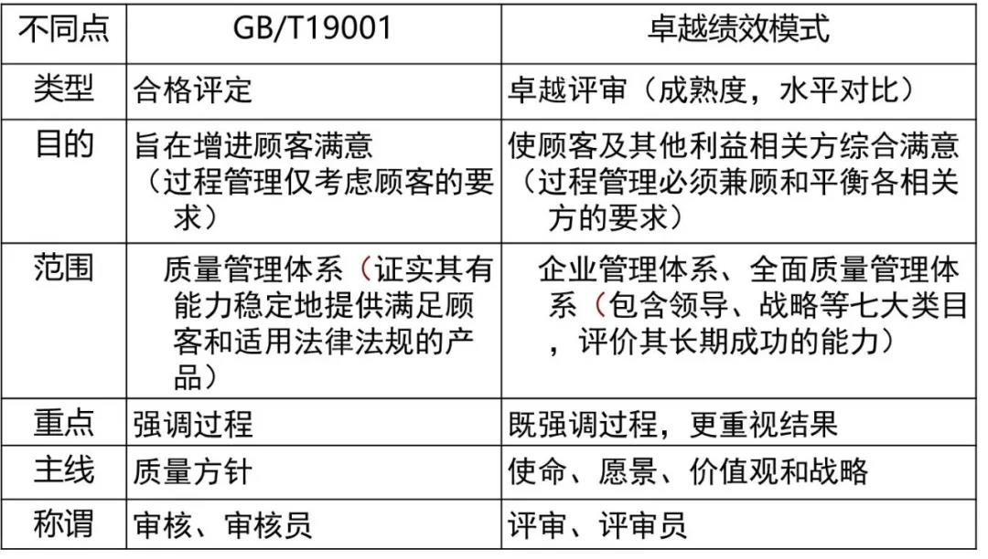 此外,卓越績(jī)效評(píng)價(jià)與質(zhì)量管理體系審核也有本質(zhì)上的不同,前者屬于診斷式的評(píng)價(jià),從管理的效率和效果入手,旨在發(fā)現(xiàn)組織最強(qiáng)和最需要改進(jìn)的方面;后者則是對(duì)過(guò)程的合格評(píng)定,從符合性入手兼顧有效性,重在發(fā)現(xiàn)與規(guī)定要求的偏差。