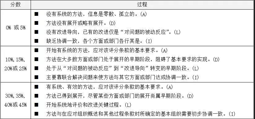 例如,“如何確定組織的使命、愿景和價(jià)值觀”。對(duì)于該類“如何”問(wèn)題的回答,按照本標(biāo)準(zhǔn)“5.0 評(píng)價(jià)方法”和“附錄B卓越績(jī)效評(píng)價(jià)要素和評(píng)分指南”需要給出幾個(gè)方面的信息:應(yīng)對(duì)條款要求的“是什么方法”(稱為“方法”)、該方法是“怎么實(shí)施的”(稱為“展開”)、是否對(duì)該方法和該實(shí)施過(guò)程進(jìn)行評(píng)價(jià)(稱為“學(xué)習(xí)”),該方法是否與標(biāo)準(zhǔn)其他條款相協(xié)調(diào)一致(稱為“整合”)。依據(jù)組織對(duì)以上四個(gè)方面的信息,對(duì)照“評(píng)分要求”中六個(gè)檔次中的描述(見(jiàn)表2),評(píng)審員可以給出一個(gè)成熟度百分比。依據(jù)對(duì)“高層領(lǐng)導(dǎo)的作用”的所有問(wèn)題的回答信息,評(píng)審員可以給出該條款的分值。