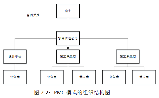 項目管理承包(PMC: project management contracting)模式下,業(yè)主直接與管理承包商簽訂合同,再由管理承包商和相關設計方和施工方簽訂合同。PMC模式的組織結構圖如下: