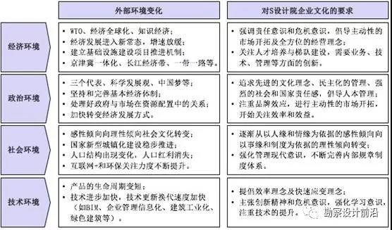 對S設計院企業(yè)文化建設提出的新要求主要從經(jīng)濟、政治、社會、技術等宏觀環(huán)境、行業(yè)發(fā)展趨勢、公司戰(zhàn)略、企業(yè)近期發(fā)生的事件、企業(yè)員工變化等方面進行系統(tǒng)分析與總結。例如,宏觀環(huán)境變化對S設計院企業(yè)文化的新要求如下: