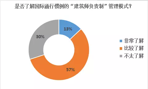 國內(nèi)“注冊建筑師”制度始于2008年。主要工作是建筑設計技術服務。而國際通行的建筑設計方的服務不僅僅涵蓋了建筑設計的過程,而且貫穿了整個建筑生產(chǎn)的過程,同時作為對整個項目的專業(yè)監(jiān)管和實際控制人,建筑設計服務涵蓋了建造過程的全部內(nèi)容和全部過程。本次調研發(fā)現(xiàn),只有13%的人非常了解國際通行慣例的“建筑師負責制”管理模式,有57%的人是屬于比較了解的,還有30%的人還處于不太了解狀況。