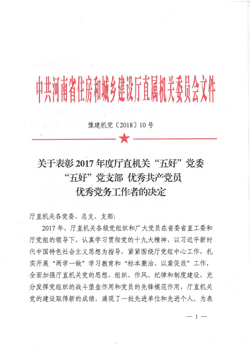 關于表彰2017年度廳直機關“五好”黨委 “五好”黨支部 優(yōu)秀共產黨員 優(yōu)秀黨務工作者的決定