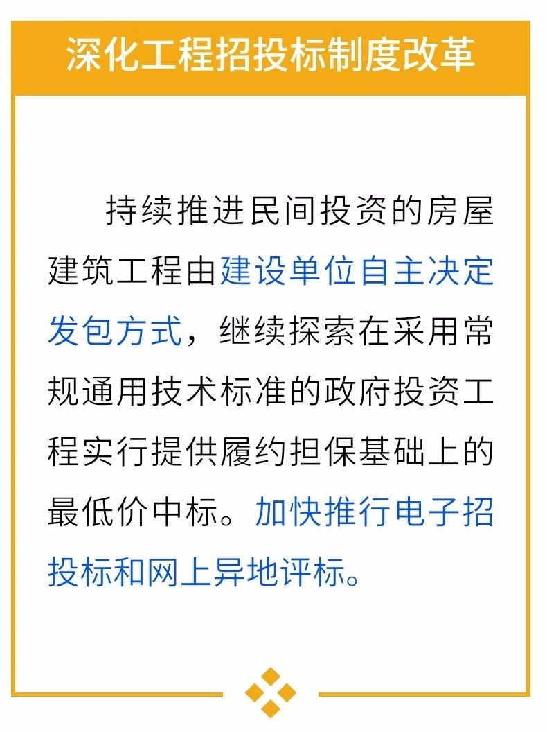 (一)深化工程招投標制度改革。持續(xù)推進民間投資的房屋建筑工程由建設(shè)單位自主決定發(fā)包方式,繼續(xù)探索在采用常規(guī)通用技術(shù)標準的政府投資工程實行提供履約擔(dān)保基礎(chǔ)上的最低價中標。研究起草進一步加強房屋建筑和市政基礎(chǔ)設(shè)施工程招投標監(jiān)管的意見,加快推行電子招投標和網(wǎng)上異地評標。加強工程招標代理機構(gòu)資格認定取消后的事中事后監(jiān)管,推行信息報送和公開制度,完善工程招標代理機構(gòu)管理。配合做好《招投標法》等相關(guān)法律法規(guī)修訂工作。