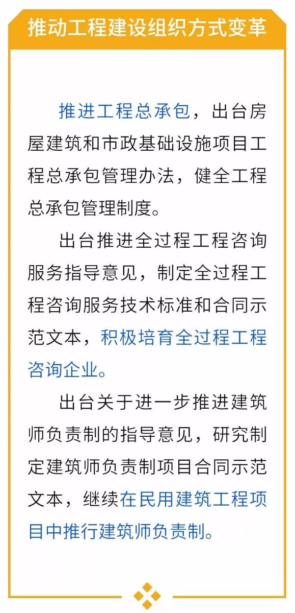 (二)推動工程建設(shè)組織方式變革。推進工程總承包,出臺房屋建筑和市政基礎(chǔ)設(shè)施項目工程總承包管理辦法,健全工程總承包管理制度。繼續(xù)修訂工程總承包合同示范文本,研究制定工程總承包設(shè)計、采購、施工的分包合同示范文本,完善工程總承包合同管理。出臺推進全過程工程咨詢服務(wù)指導(dǎo)意見,制定全過程工程咨詢服務(wù)技術(shù)標準和合同示范文本,積極培育全過程工程咨詢企業(yè)。出臺關(guān)于進一步推進建筑師負責(zé)制的指導(dǎo)意見,研究制定建筑師負責(zé)制項目合同示范文本,繼續(xù)在民用建筑工程項目中推行建筑師負責(zé)制。