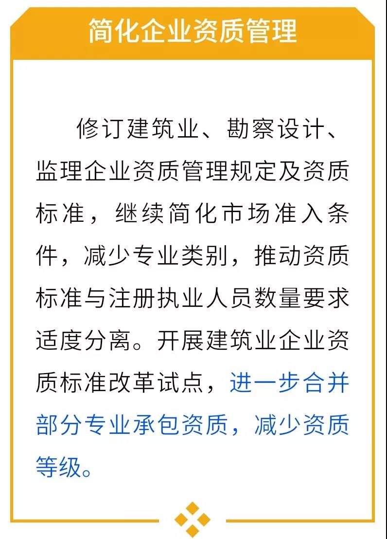 (七)簡化企業(yè)資質(zhì)管理。修訂建筑業(yè)、勘察設(shè)計、監(jiān)理企業(yè)資質(zhì)管理規(guī)定及資質(zhì)標準,繼續(xù)簡化市場準入條件,減少專業(yè)類別,推動資質(zhì)標準與注冊執(zhí)業(yè)人員數(shù)量要求適度分離。開展建筑業(yè)企業(yè)資質(zhì)標準改革試點,進一步合并部分專業(yè)承包資質(zhì),減少資質(zhì)等級。研究放開工程設(shè)計和建設(shè)工程服務(wù)領(lǐng)域外商投資準入限制,對外商投資工程設(shè)計和建設(shè)工程服務(wù)企業(yè)實施準入前國民待遇加負面清單管理模式。