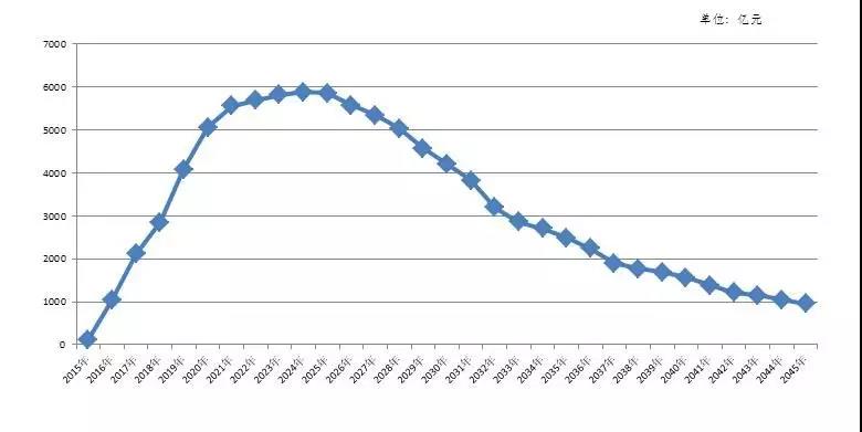 從地區(qū)分布看,中西部地區(qū)支出壓力較大。2015-2045年間,支出責(zé)任總額前五位的分別為湖南8047億元、河南7086億元、四川6906億元、內(nèi)蒙古6241億元和云南5896億元,年均支出分別為260億元、229億元、222億元、201億元和190億元,分別占2017年本省一般公共預(yù)算支出的3.8%、3.1%、2.6%、4.4%和3.3%。
