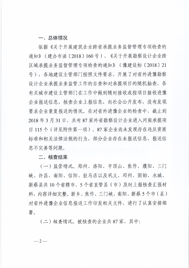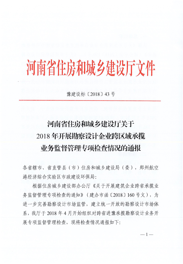 省住建廳關(guān)于2018年開展勘察設(shè)計企業(yè)跨區(qū)域承攬業(yè)務(wù)監(jiān)督管理專項檢查情況的通報