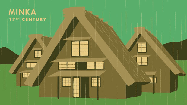 民家是日本山地居民常用的民居式建筑,高聳的坡屋頂對緩解積雪起了很大的作用。