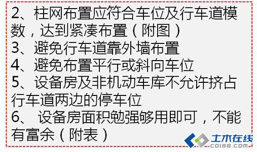 1:大車位沿周邊布置,保證2700x5300mm,沿邊柱距可取6000mm