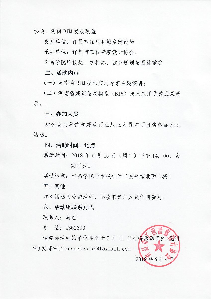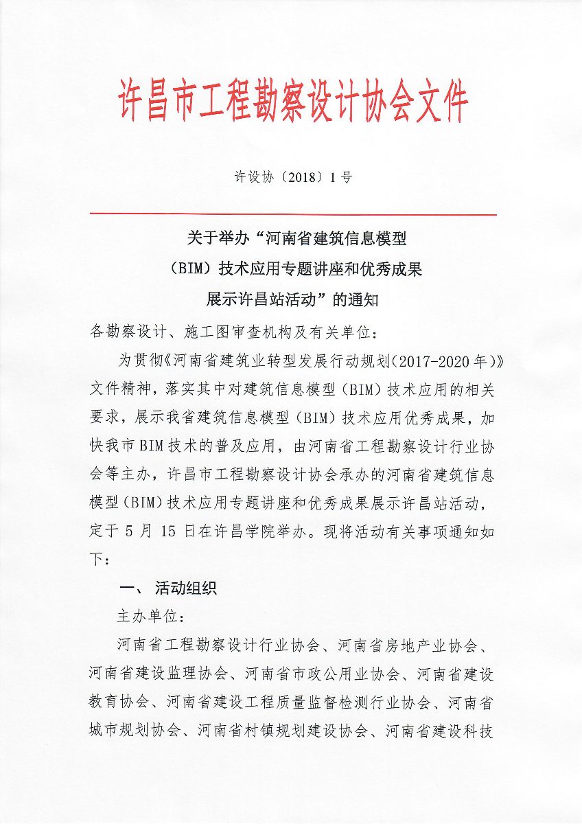 許昌市工程勘察設計協(xié)會關于舉辦“河南省建筑信息模型(BIM)技術應用專題講座和優(yōu)秀成果展示許昌站活動”的通知