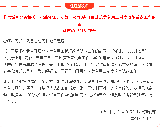 2016年4月11日,住房和城鄉(xiāng)建設部批準浙江、安徽、陜西3省開展建筑勞務用工制度試點工作方案,隨后安徽省、浙江省、陜西省陸續(xù)發(fā)布“建筑勞務用工制度改革試點方案”。