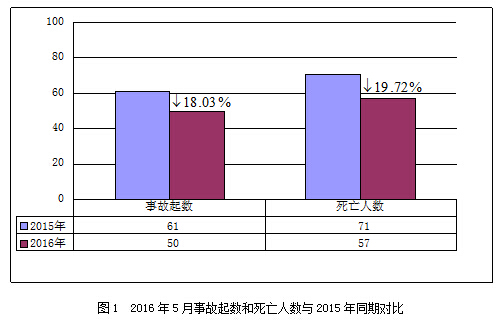 2016年5月,全國共發(fā)生房屋市政工程生產(chǎn)安全事故50起、死亡57人,比去年同期事故起數(shù)減少11起、死亡人數(shù)減少14人,同比分別下降18.03%和19.72%(見圖1)。
