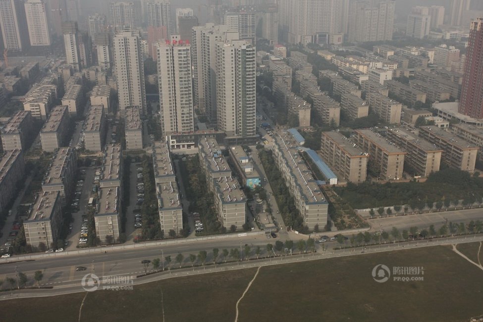 2013年10月05日,陜西省西安市,筆者搭乘直升機從大明宮遺址公園西側(cè)上空飛過,在空中見大明宮西側(cè)一條新修的路被6棟新蓋的樓擋了一半路面,以前只見過老樓、釘子戶擋了路,新樓擋新路還是頭一回見到。魏永賢 攝