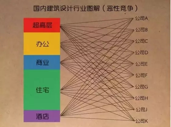 國外建筑設(shè)計行業(yè)按照建筑物的使用功能細分成各種專業(yè)公司,而國內(nèi)設(shè)計公司超高層、住宅、辦公、醫(yī)院、商業(yè)、學(xué)校樣樣都做,樣樣都不專業(yè)。因為專業(yè),國外的設(shè)計費高于國內(nèi)而且不斷上漲,整個行業(yè)形成了良性壟斷,大家都有穩(wěn)定的細分市場,形成良好的協(xié)作關(guān)系。因為不專業(yè),國內(nèi)的設(shè)計費10年不漲,整個行業(yè)形成了惡性競爭,大家都去搶單,形成了惡性的搶奪關(guān)系。大家在你爭我奪的過程中,自然而然的讓國外公司搶占了整個行業(yè)的高端市場。道理很簡單一分價錢一分貨,價格是由市場決定的。究其原因,國內(nèi)建筑設(shè)計公司追求短期利益的占大多數(shù),很遺憾追求企業(yè)長期發(fā)展和打造品牌的占極少數(shù)。當(dāng)老板們都賺到錢回過頭來做品牌的時候,發(fā)現(xiàn)公司品牌已經(jīng)被市場定位了,那設(shè)計費也只能被市場定位了。