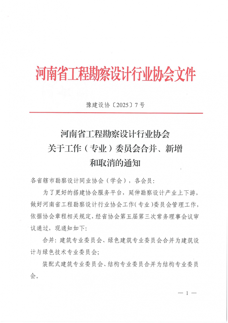 各省轄市勘察設(shè)計(jì)同業(yè)協(xié)會(huì)(學(xué)會(huì)),各會(huì)員: 為了更好的搭建協(xié)會(huì)服務(wù)平臺(tái),延伸勘察設(shè)計(jì)產(chǎn)業(yè)上下游,做好河南省工程勘察設(shè)計(jì)行業(yè)協(xié)會(huì)工作(專業(yè))委員會(huì)管理工作,依據(jù)協(xié)會(huì)章程相關(guān)規(guī)定,經(jīng)省協(xié)會(huì)第五屆第三次常務(wù)理事會(huì)議審議通過(guò),現(xiàn)通知如下: 合并:建筑專業(yè)委員會(huì)、綠色建筑專業(yè)委員會(huì)合并為建筑設(shè)計(jì)與綠色技術(shù)專業(yè)委員會(huì);裝配式建筑專業(yè)委員會(huì)、結(jié)構(gòu)專業(yè)委員合并為結(jié)構(gòu)專業(yè)委員會(huì)。 新增:河南省工程勘察設(shè)計(jì)協(xié)會(huì)管道業(yè)委員會(huì) 取消:河南省工程勘察設(shè)計(jì)行業(yè)協(xié)會(huì)工程總承包工作委員會(huì) 2025年3月17日
